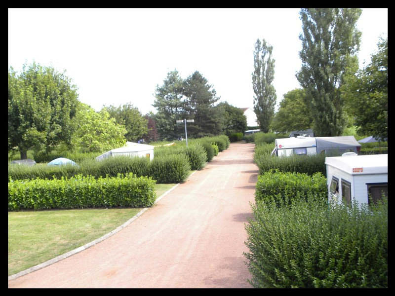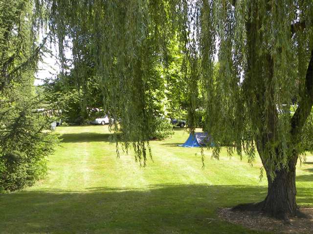 Camping familial en bord de rivière avec des emplacements ombragés.
