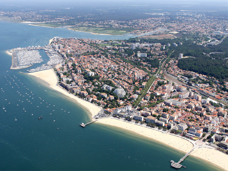 Arcachon est la plus grande ville du Bassin d'Arcachon, presque entièrement clos et qui semble former un lac, mais est ouvert sur l'Atlantique à son extrémité sud.