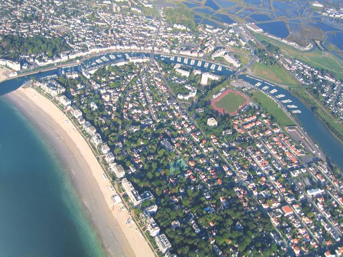 La Baule, station de renommée internationale, vit au rythme des saisons...Située entre les ports de Pornichet et du Pouliguen, la baie de La Baule est un ruban de sable fin d'une longueur de 9 km.Nombreuses sont les villas avec une architecture unique et originale. Les 3 stations balnéaires (Pornichet, La Baule, Le Pouliguen) méritent bien leur surnom de "drôles de dames"... et la baie de la Baule a fait sa renommée comme un des "plus belles baies du monde" ! La première activité balnéaire est naît au Croisic, puis gagne les autres communes (Le Pouliguen, Pornichet), notamment grâce au développement du chemin de fer, arrivé à Saint-Nazaire en 1857. C’est un peu plus tard, que la liaison Saint-Nazaire - Le Croisic sera mise en place, et desservira "La Bôle", un lieu-dit quasiment désert, au milieu de dunes plantées de pins maritimes. En 1880, il restait un vaste espace boisé sans construction entre le quartier Benoît et le lotissement Hennecart. Cet espace de 4 hectares fut acheté en 1895 (à la Société des Dunes). Cette acquisition lui permit de fonder un institut marin pour enfants malades atteints de tuberculose. L’Institut Verneuil fut inauguré en 1896, il ne fonctionnera que quelques années.Grâce aux concours de riches entrepreneurs et commerçants, une station balnéaire est créée de toute pièce, en même temps qu’elle s’orthographie "La Baule". En 1902, le fils de Mme Pavie, Joseph, devient vice président de la Société des Instituts Marins. Cet ancien maire de La Baule (1919-1925) sera le grand promoteur du lotissement Pavie. Il va modifier le quartier en affirmant un grand modernisme. Il fit établir un réseau d’avenues et multiplia les nouveautés techniques avec : - l'installation d’un service postal et télégraphique dans un style oriental - une usine électrique et un service d’eau - un Tramway à pétrole : La navette qui reliait toute la baie du Pouliguen à Pornichet Grâce à Joseph Pavie, l’institut Verneuil est transformé en palace intégrant un casino, et les villas ne tardent pas à proliférer. La station prend ainsi un caractère mondain, caractère qui sera renforcé dans les années 20 sous l’impulsion de M. André. Aujourd'hui, La baule reste une destination très prisée pour les familles modestes et plus aisées.