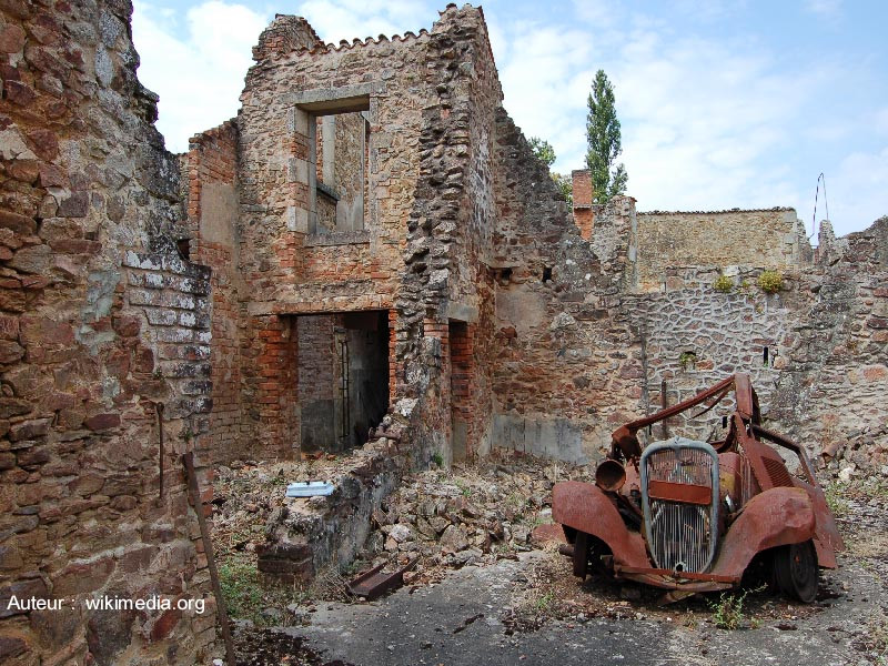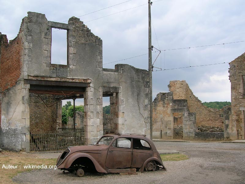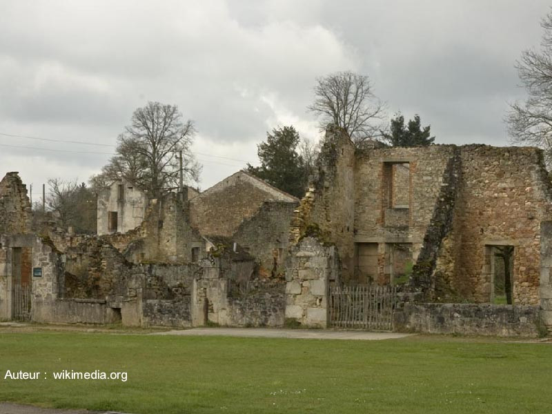 Le 10 Juin 1944, (Date historique marquant les esprits) la population du bourg limousin d’Oradour-sur-Glane est massacrée par une troupe d’environ 200 Allemands. Les hommes sont séparés des femmes et des enfants et sont exécutés simultanément dans plusieurs endroits clos du bourg. Les femmes et les enfants sont enfermés dans l’église et sont massacrés par les gaz, des grenades et autres explosifs avant d’être mitraillés. Le feu est ensuite mis à l’église, le village pillé est incendié, et réduit en quelques heures à un champ de ruines. Conservé en l’état, ce site témoigne dès la libération des atrocités nazies et de la nécessité du souvenir, en hommage aux 642 victimes d’un crime abject.